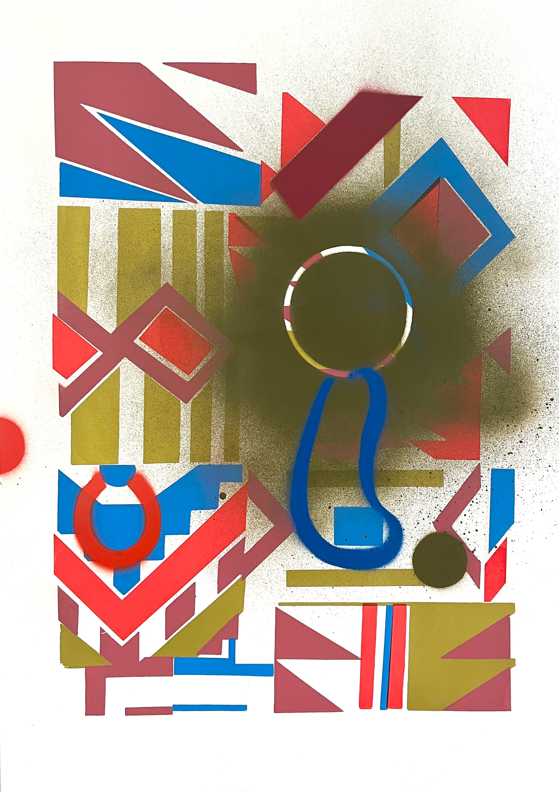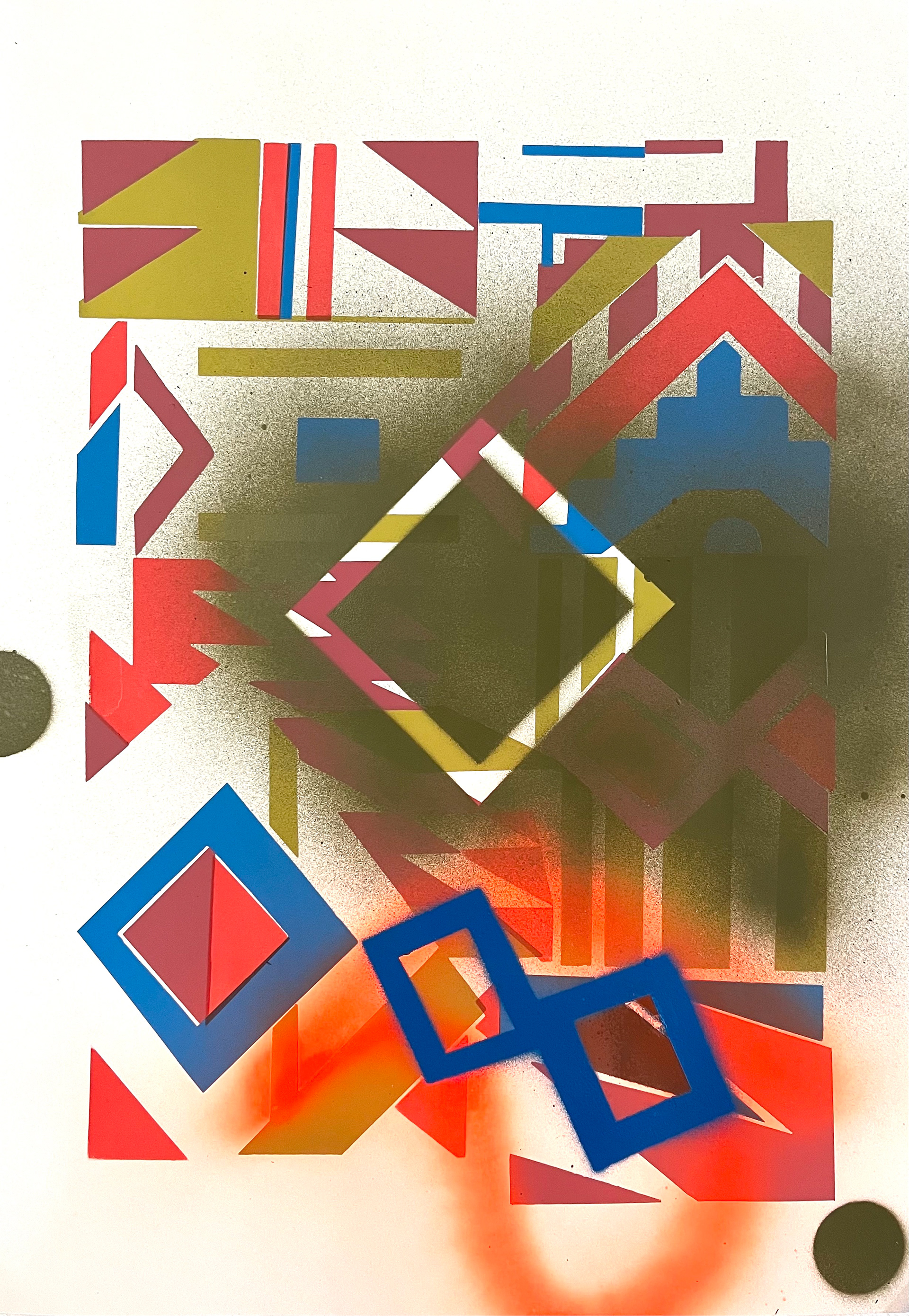 Silk screen prints with spray paint intervention.