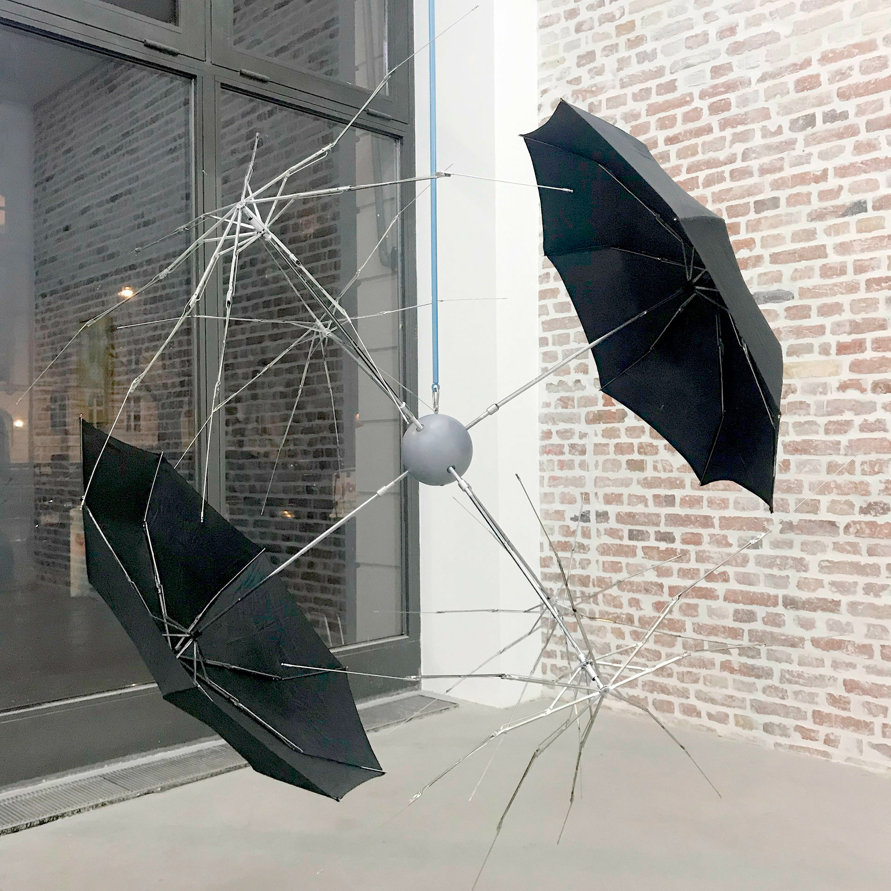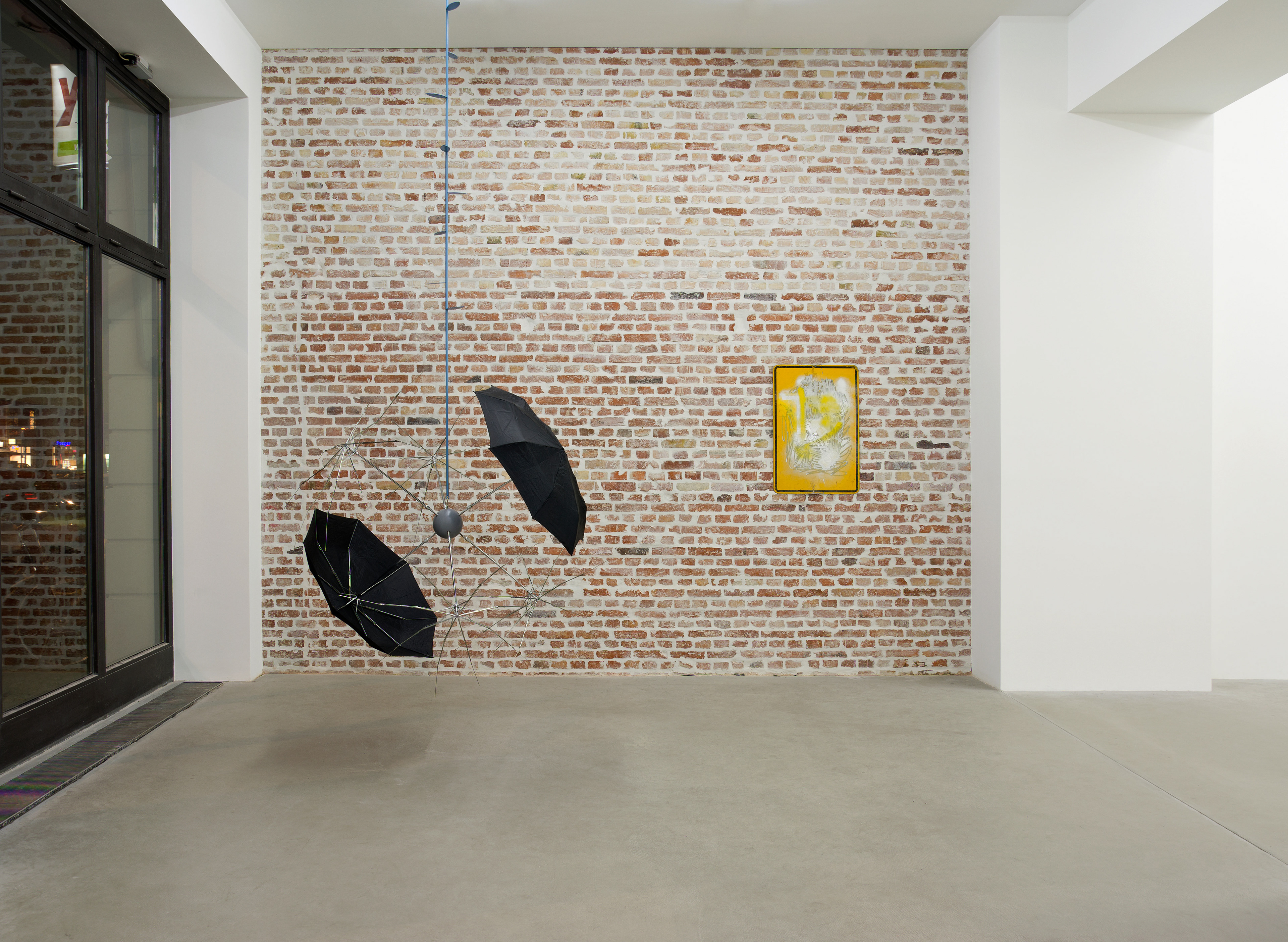 Donni, 2019, metal powdercoated, fabrics, 380 cm, diameter 145 cm, installationview: Schickeria Sieben, LAGE EGAL Berlin