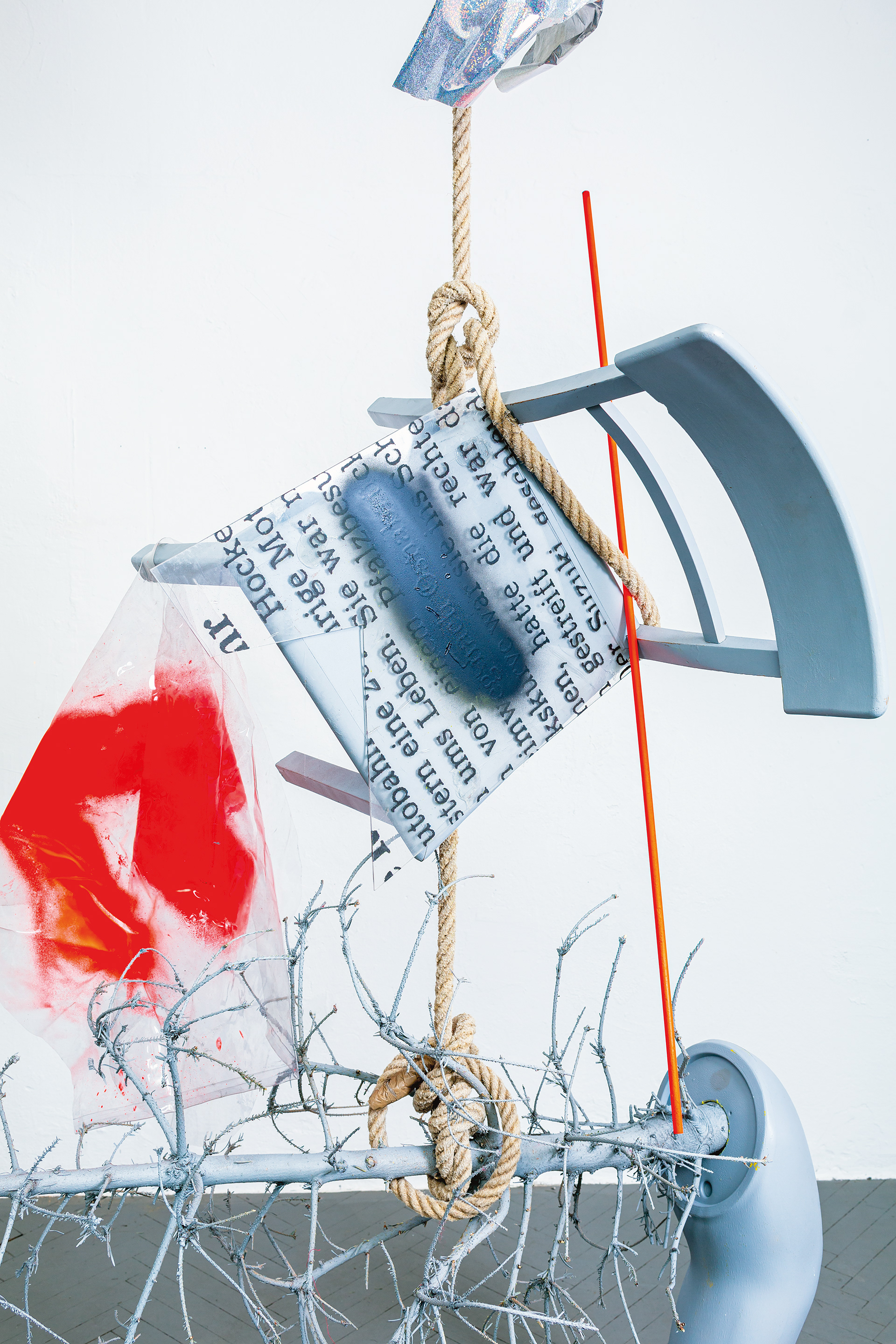 Rope, Christmas tree, chair, plexiglass (printed surface), plastic sheet,