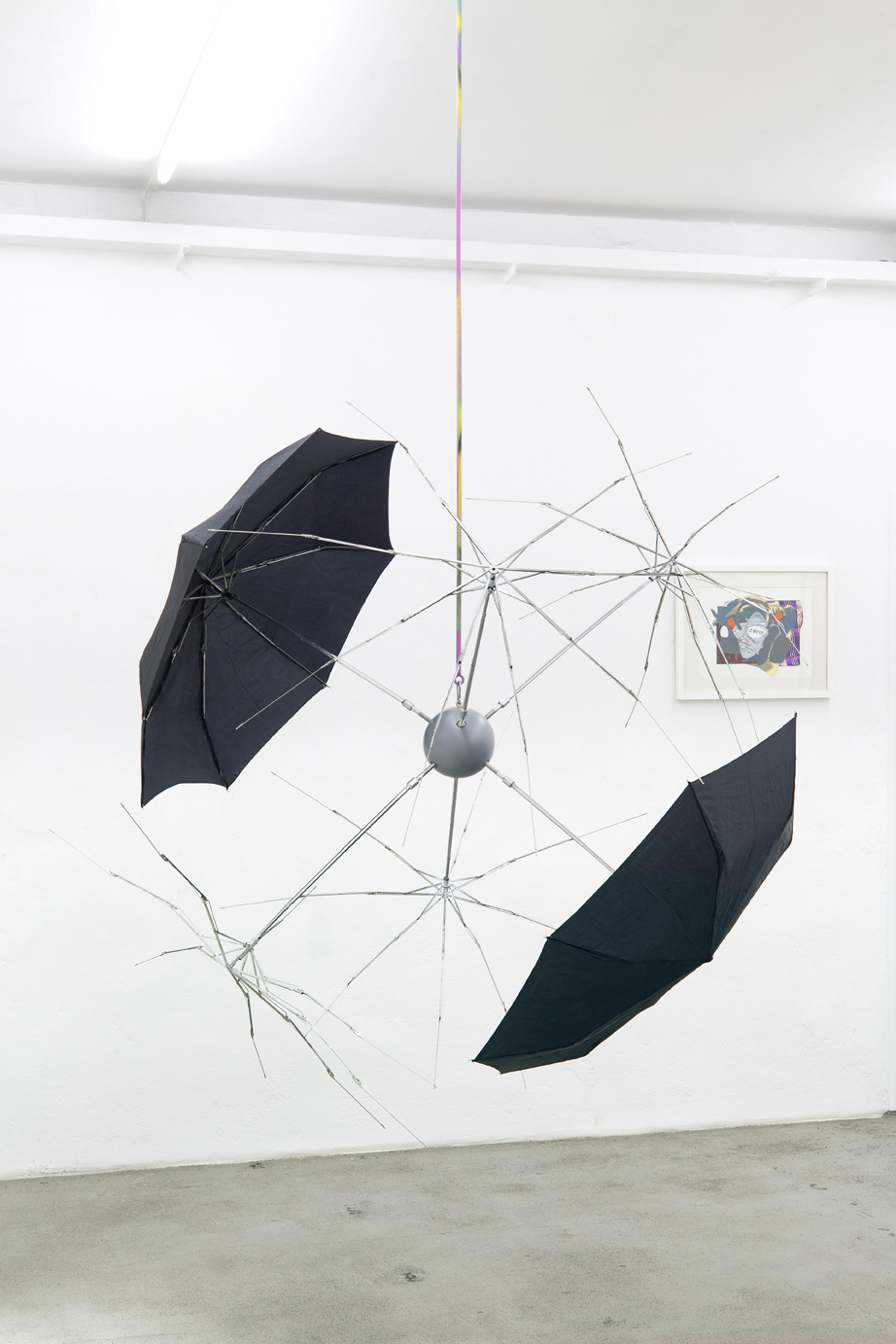 Two umbrellas, printed fabric, hula hoop, wood, acrylic glass,