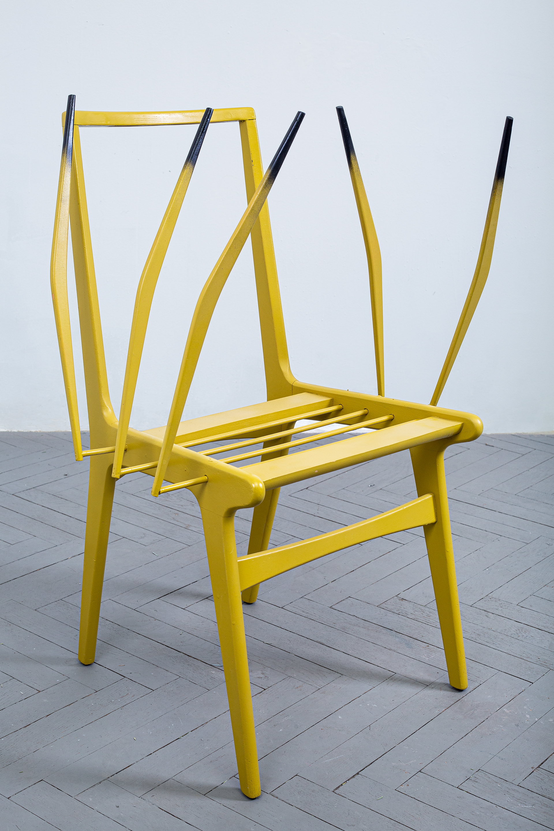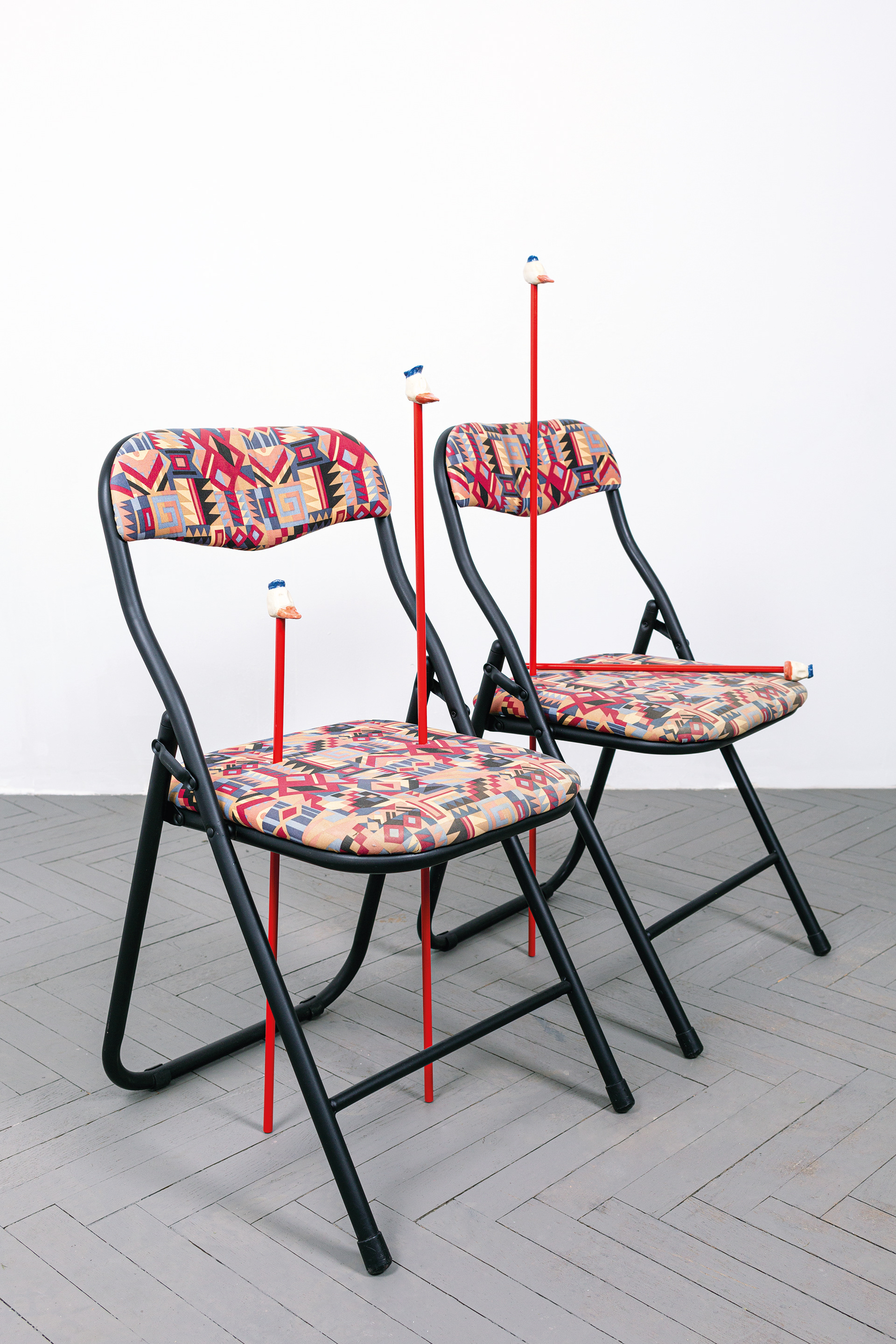 Chairs, textiles, powder-coated metal, ceramic, paint, 110 x 100 x 60 cm